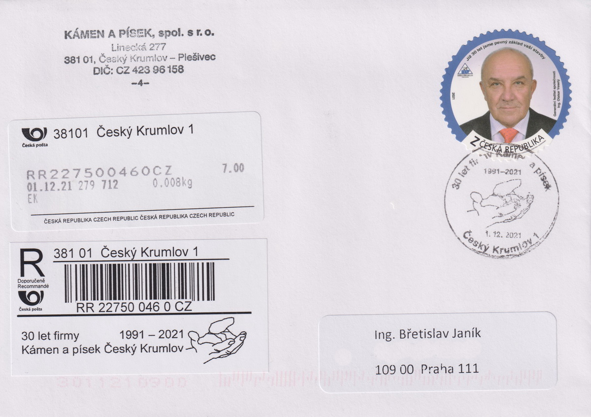 Ukázka archové emise jihočeské česko rakouské společnosti Kámen a písek. Opět byla zvolen kruhový koncept známek a z 25ti známek každá jiná. Známky jsou používány zejména ve firemním styku.