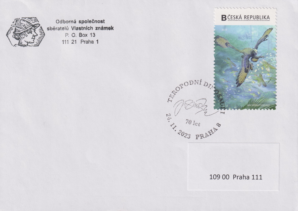 Bohatá ukázka z poslední emise VZ TL 0174 přináší jak první den použití 3. 11. 2023, tak smíšenou frankaturu doporučených zásilek s provizorním (rukou psaným) Apostem i poruchy tisku apostových nálepek (bez tisku dne podání 8. listopadu, který se na nálepku špatným vložením listu již nevešel), tak i řádný stav. I když je to pracnější, je razítko pro každou známku samostatně tou nejsprávnější variantou, byť není nejčastější.